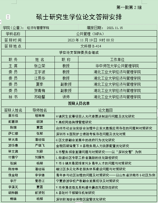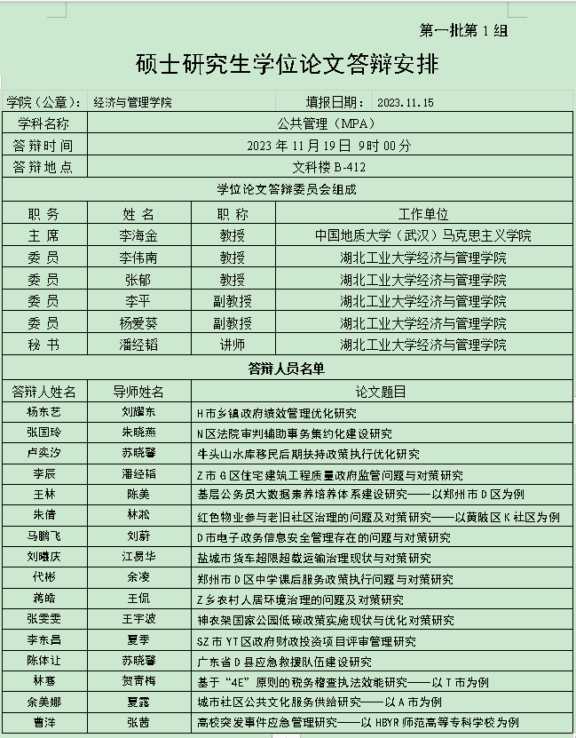硕士研究生学位论文答辩安排