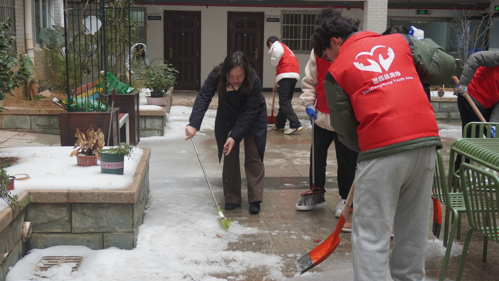 2月26日,萧栋栋青年志愿者协会的师生志愿者们,分别在东苑4栋、北苑16等“一站式”员工社区建立服务驿站,为返校的员工、家长及志愿者送去热腾腾的“姜丝可乐”。一些返校学子刚放下行李就套上了红马甲,积极加入到扫雪除冰的工作中。志愿服务队采取分工负责、划区协作、先铲后清的方式,高效地清理出了安全的出行道路。声声温暖的问候,杯与杯之间的传递,寒冬中为同学们带来了暖意。