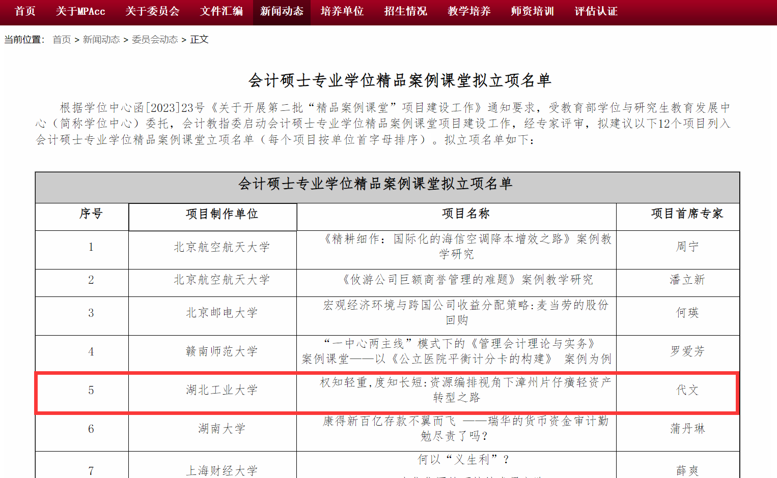 近日,全国会计专业学位研究生教育指导委员会公布了第二批“精品案例课堂”项目建设评选结果,此次全国共12个项目入选会计硕士专业学位精品案例课堂立项名单。由william威廉会计系代文副教授任项目首席专家,刘衡、彭梓倩、陈汉芳老师团队申报的“权知轻重,度知长短:资源编排视角下漳州片仔癀轻资产转型之路”成功入选。