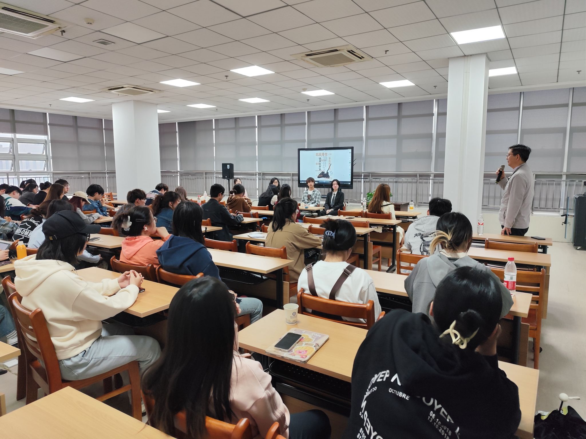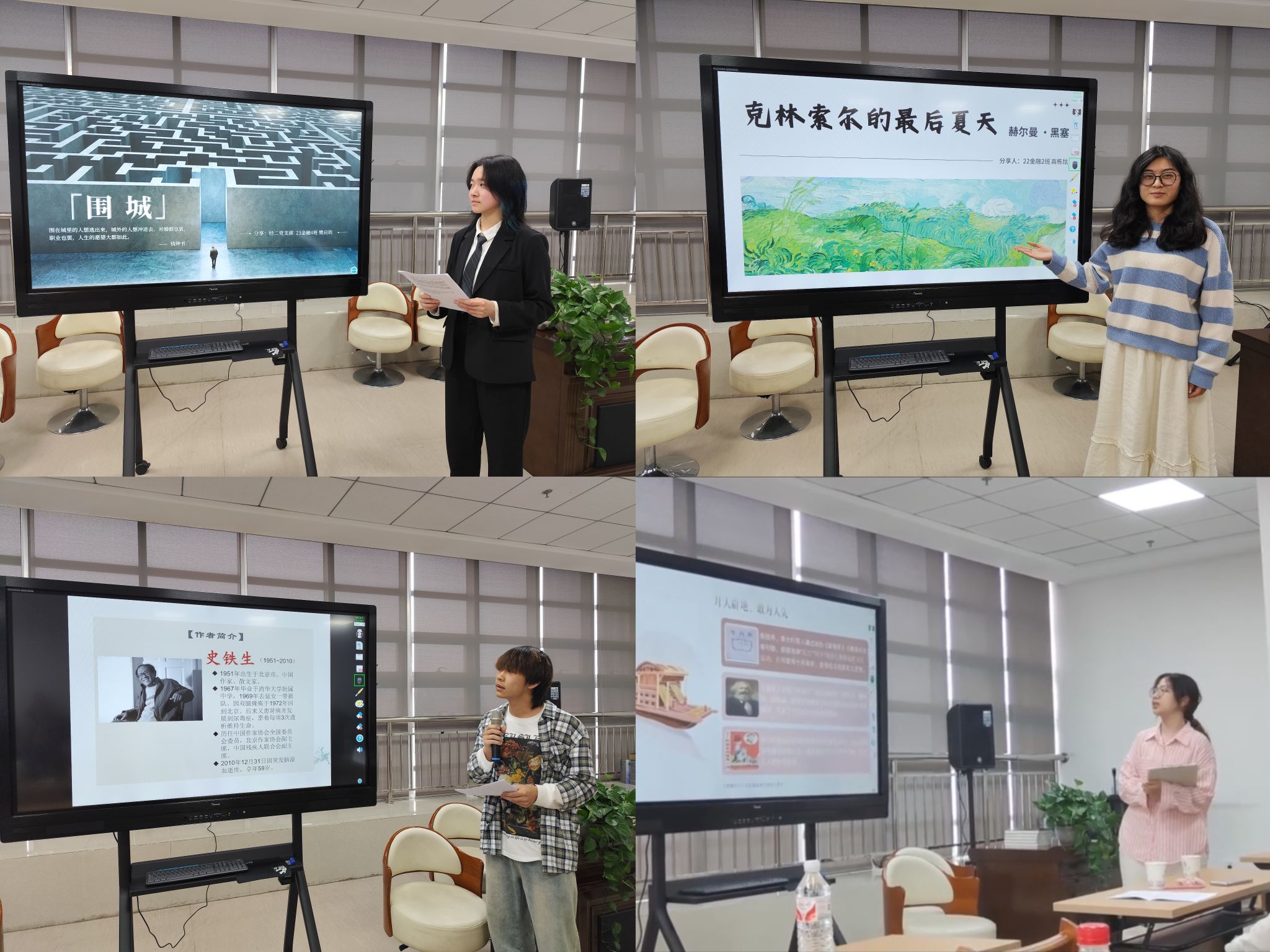 分享会上,23金融4班张益玮分享了史铁生的《我与地坛》,鼓励同学们要有勇气面对生活的挫折;23金融4班樊启玥从不同角度介绍了《围城》的创作背景;22金融2班高栋炫解读了黑塞的《克林索林的夏天》中关于生命的意义和价值;22金融4班田佳宜通过讲述《觉醒年代》,带领同学们重温追求真理、燃烧理想的澎湃岁月。